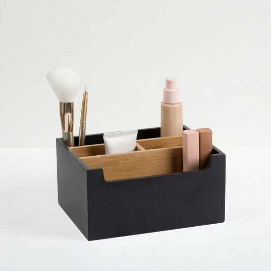 Deze make-up organizer is zwart van kleur met details van bamboe. Dit geeft de praktische organizer een luxe uitstraling. Kies uit de variant zonder of met lade.