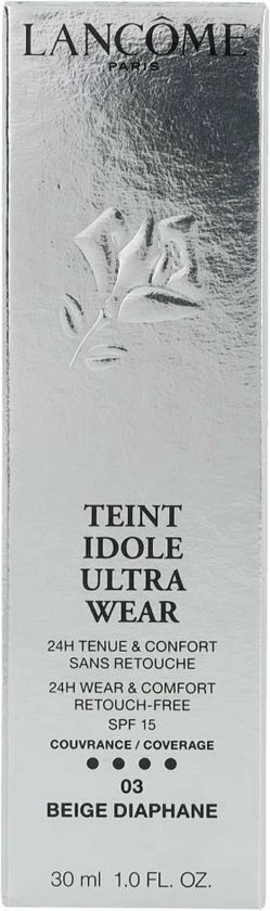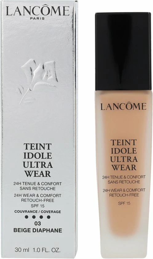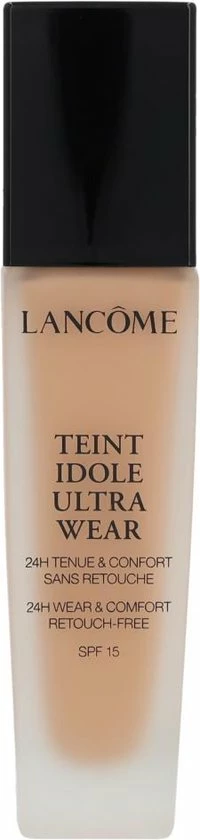 Lanc?me Teint Idole Ultra Wear Foundation is een vloeibare, fluweelzachte volledig dekkende foundation. De vloeibare foundation zorgt er qua structuur voor dat je huid zich 24 uur comfortabel voelt en de gehele dag goed blijft zitten. De frisse en smeltende foundation zorgt voor een egale huid, die fluweelzacht aanvoelt. De Lanc?me Teint Idole Ultra Wear Foundation geeft je huid een matte en onberispelijke finish en is verkrijgbaar in veel kleuren.