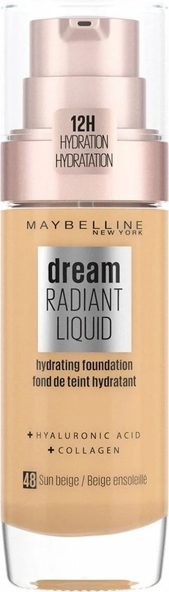 De Dream Radiant Liquid Foundation 48 Sun Beige van Maybelline New York is een medium dekkende hydraterende foundation met stralende pigmenten, hyaluronzuur en collageen: