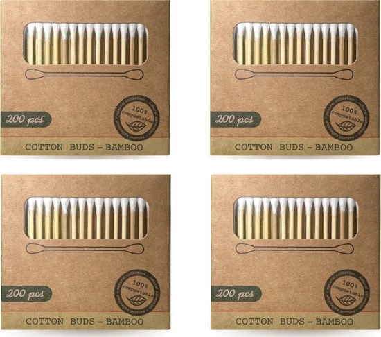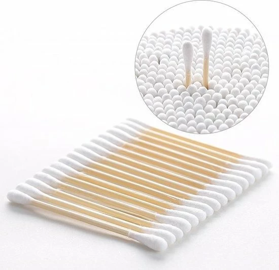 Milieuvriendelijke wattenstaafjes van hout en katoen met een minimalistische verpakking.