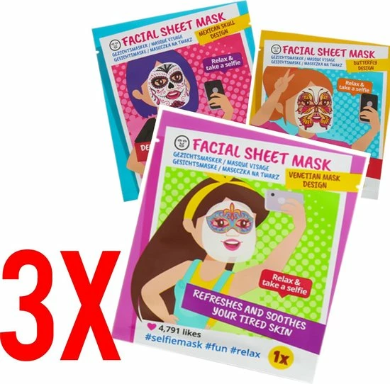 Last van een onzuiverheden of een droge- of een vermoeiende huid? Dit gezichtsmasker reinigt en verfrist, met een zachte huid als resultaat.br /br /Voordelen: br /✓Leuk om selfies mee te makenbr /✓Grappige designbr /✓Ook handig voor onderweg of op reisbr /✓3x Selfie Masks inbegrepen